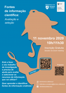 No próximo dia 11 de novembro de 2020, entre as 10:00 e as 11:30 horas, a Biblioteca do Instituto Superior Técnico realizará uma sessão de formação por videoconferência, através da plataforma Zoom, dirigida aos estudantes do 1.º, 2.º e 3.º ciclos, sobre os critérios de avaliação a utilizar para a seleção de fontes de informação científica.